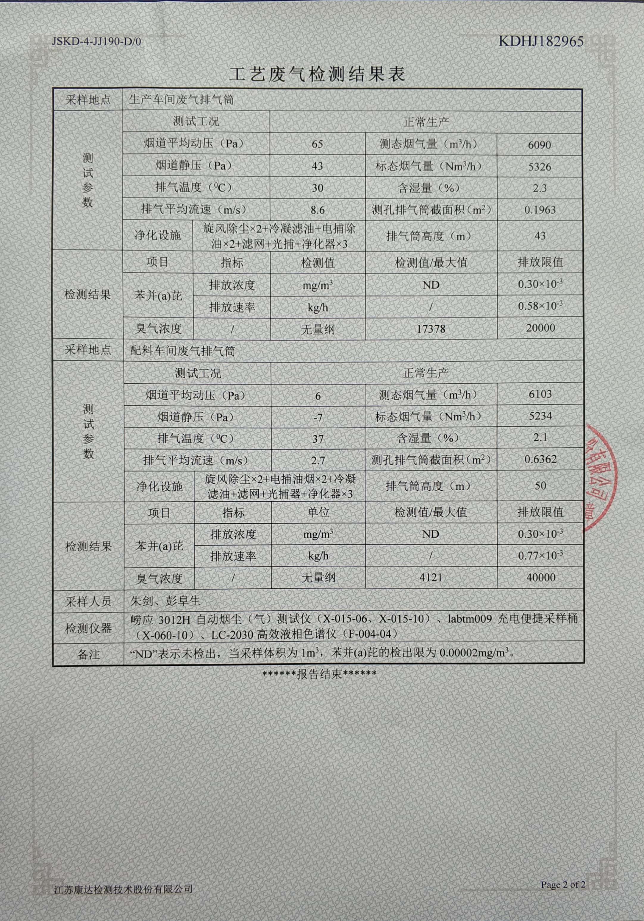 2018-6-27我司委托江蘇康達檢測技術有限公司對工藝廢氣進行檢測,報告如下